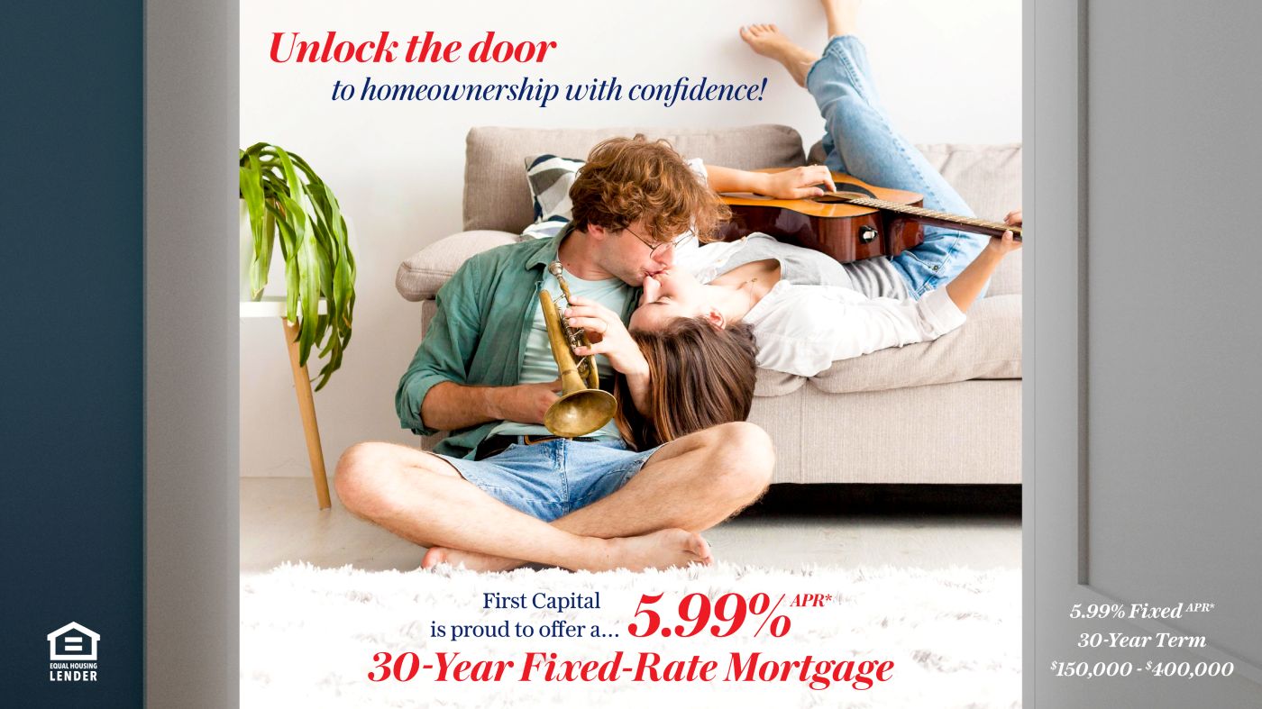 *APR=Annual Percentage Rate. All loans subject to credit approval. 5.99% APR applies to mortgages for 30-year fixed term. Minimum credit score of 700 to receive promotional rate. Maximum loan to value (LTV) not to exceed 80%. Minimum loan amount to qualify for this offer is $150,000.00, with a maximum loan amount of $400,000. Owner-occupied primary residence only Only eligible for single-family, owner-occupied properties in the state of PA. No manufactured homes, second homes, business, or investment properties. First Capital Federal Credit Union reserves the right to end this promotion at any time. Offer valid on purchases or rate and term refinances only. Certain additional restrictions may apply. Rates, terms, and conditions are subject to change and may vary based on credit worthiness, qualifications, and collateral requirements. Other home loan products, rates, and terms are available. Cannot be combined with any other offer. Effective January 1 - March 31, 2026.