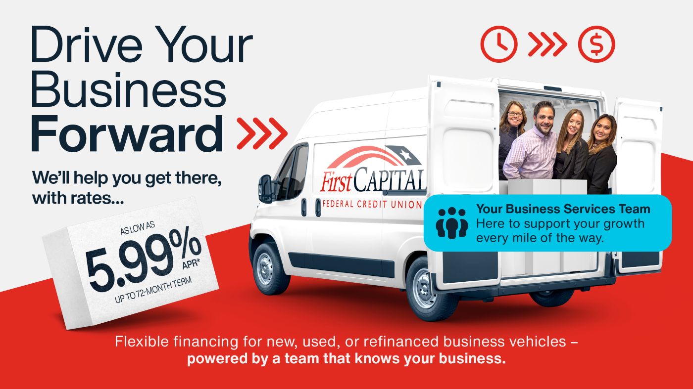 *APR=Annual Percentage Rate. All loans subject to credit approval. Rates, terms, and conditions are subject to change at any time and may vary based on credit worthiness, qualifications, and collateral conditions. Estimated monthly payment of $16.61 for every $1,000.00 borrowed at 5.99% for 72 months. Loan to Value (LTV) not to exceed 100%. Business vehicles must be 2023 year or newer. Offer valid for Sole Proprietorships, General Partnerships, Corporate, LLC, and Limited Partnerships based in Pennsylvania. Valid on new money only, cannot be used on existing First Capital Federal Credit Union loans. Cannot be combined with any other offer and may be discontinued at any time. Other terms or conditions may apply. Effective January 1 – March 31, 2026.