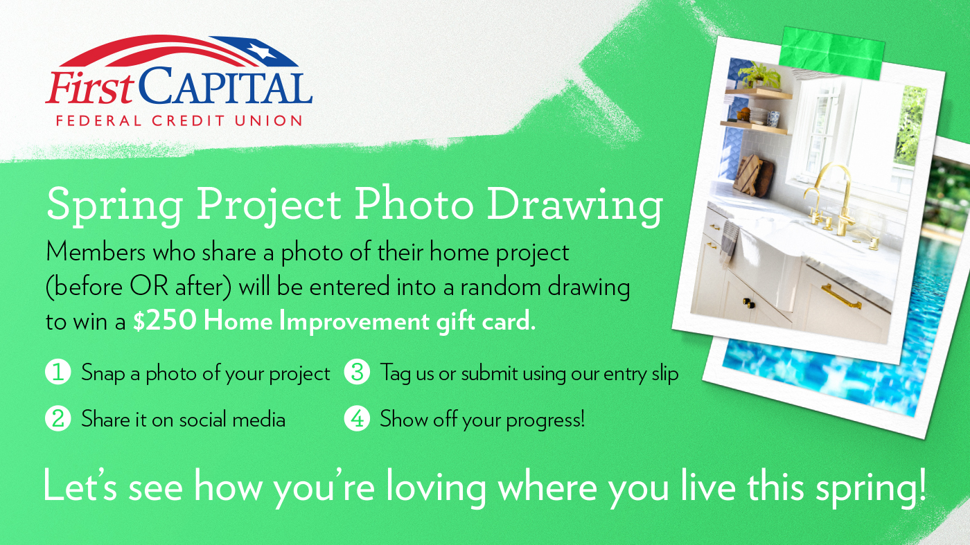*APR=Annual Percentage Rate. All loans subject to credit approval. 5.25% APR applies to Fixed Home Equity loans for terms up to 120 months. Minimum credit score of 650 to receive promotional rate. Maximum loan to value (LTV) not to exceed 80%. Minimum loan amount to qualify for this rate offer is $15,000.00. Estimated monthly payment of $10.74 per $1,000 borrowed at 5.25% for 120 months. First Capital Federal Credit Union will pay all appraisal and closing costs. Additional fees may apply. Property insurance required. Flood insurance may be required. Consult your tax advisor on possible tax benefits. Owner-occupied primary residence only and must be in first or second lien position. First Capital Federal Credit Union reserves the right to end this promotion at any time. Offer valid on new money only and cannot be used on existing First Capital Federal Credit Union loans. Certain additional restrictions may apply. Rates, terms, and conditions are subject to change and may vary based on credit worthiness, qualifications, and collateral requirements. Other home loan products, rates, and terms are available. Cannot be combined with any other offer other than the FirstCapital Star Rewards® 3-star discount. Effective April 1- June 30, 2026. Federally Insured by NCUA. Equal Housing Lender.